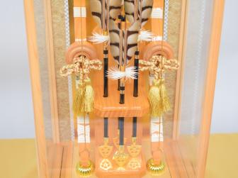 日本三大人口美林のひとつ天竜檜を使用した破魔弓です。 檜には、効能として、芳香による癒し・リラックス効果、抗菌・消臭作用があります。 当店の総檜造り破魔弓は、製材の際に木の節の部分は使わず、美しく見える部分だけを贅沢に使用しています。 また、当破魔弓の光苑は箙(正面の部分)・背景の部分に伝統工芸品である寄木細工を使用しております。