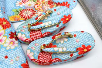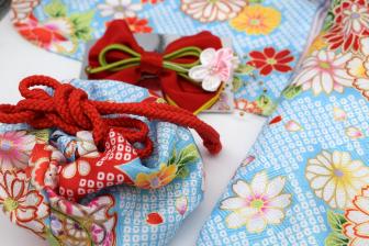 ・カラー:水色 × 赤 × 白(華やかな花柄)