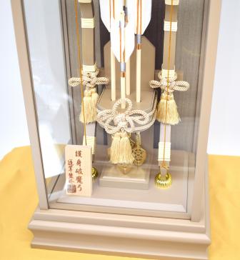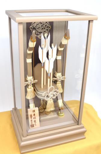 上品なベージュ調の木製ケースに収めた、気品漂う破魔弓飾りです。