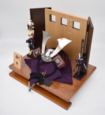 本作は、落ち着いた木目の飾り台と屏風に、本格的な兜と弓太刀を配した内飾りタイプ。